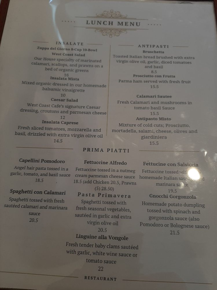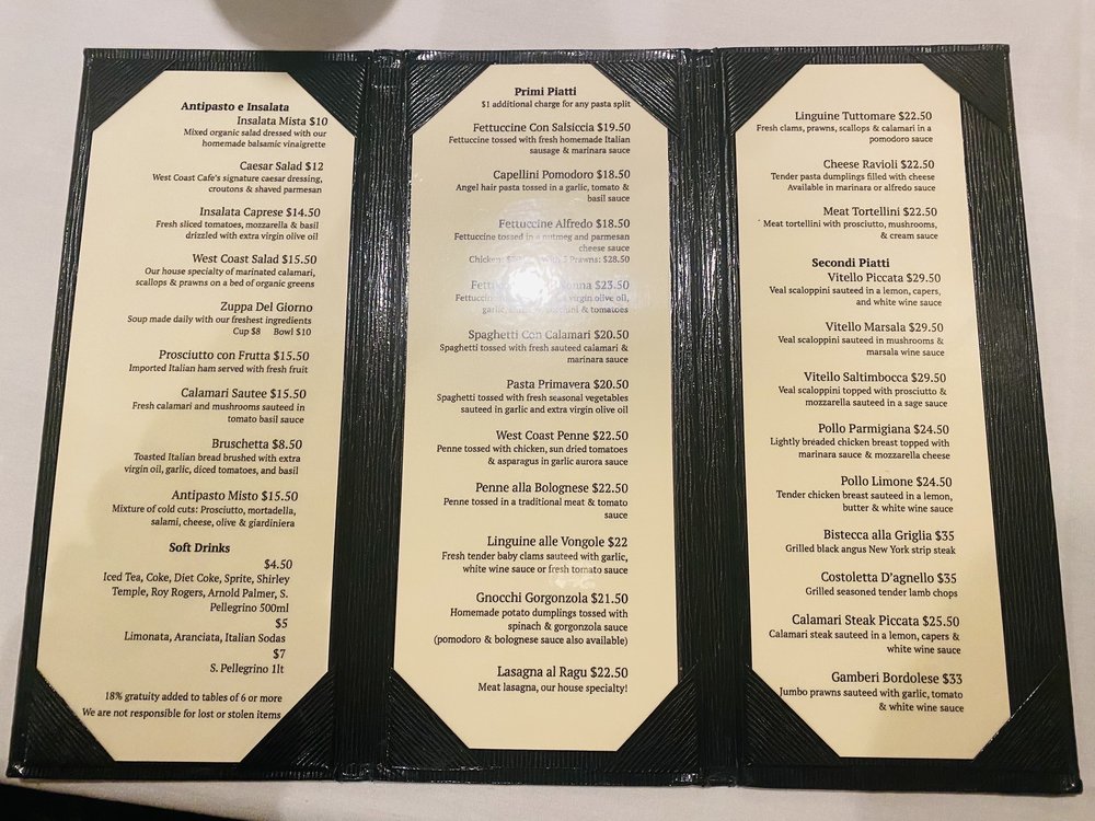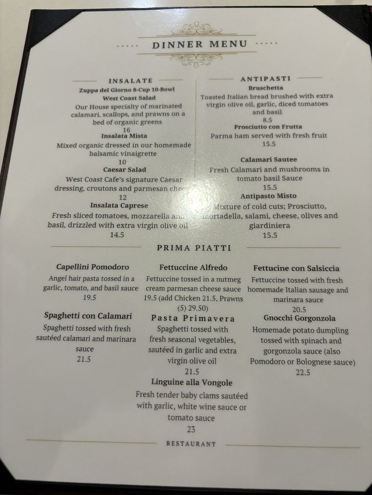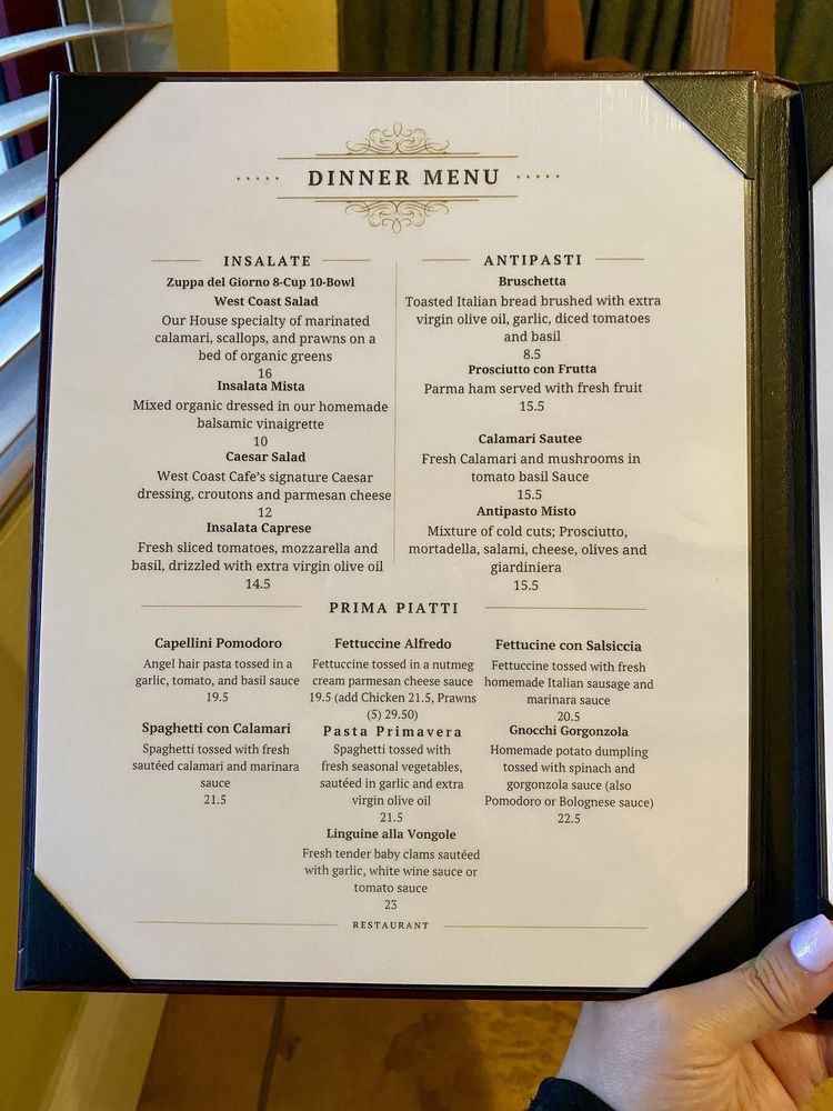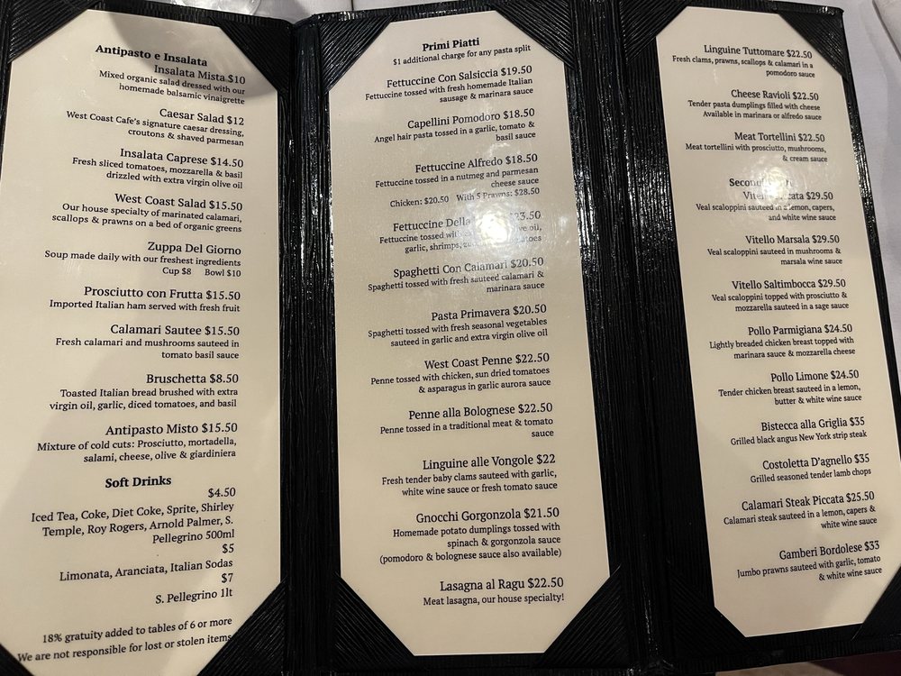 Introducing the menu at West Coast Cafe, a hidden gem in San Bruno, CA offering a variety of Italian dishes. The antipasto options like the Insalta Mista and West Coast Salad showcase fresh ingredients and homemade dressings. For primi piatti, indulge in the flavorful Fettuccine Con Salsiccia or the Capellini Pomodoro. The Secondi Piatti features classic Italian dishes like Vitello Piccata and Pollo Parmigiana. Customers rave about the friendly service, cozy atmosphere, and delicious pasta dishes. The restaurant also offers outdoor seating, making it a perfect spot for a casual dinner with family or friends. Don't miss out on the mouthwatering offerings at West Coast Cafe for a truly satisfying dining experience.